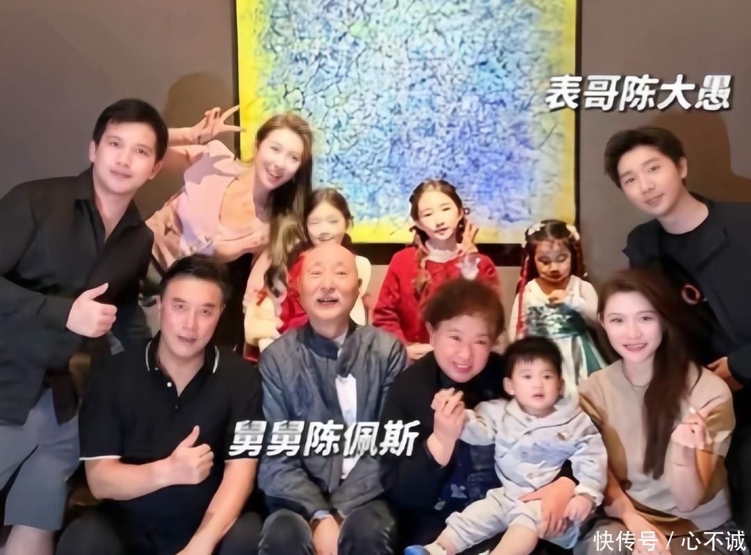 饭后,一家人又拍了一张全家福,陈佩斯妹妹陈丽达也来了,她抱着外孙笑得特别开心,和老公张山坐在哥哥陈佩斯的两边。而坐在她左边的正是陈佩斯的亲家媳妇。孩子们团团围在他们身边,整个场面热闹得不得了。这张全家福,不光留住了这份温馨时光,也彰显了陈佩斯一家浓浓的亲情。家人虽然生活在不同城市,能凑在一块儿,本身就弥足珍贵。