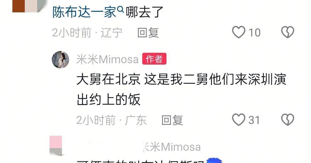 除了妹妹陈佩斯外,陈佩斯还有个哥哥叫陈布达。有网友就好奇了,家族聚会的时候,怎么没看到大舅陈布达的身影呢?张嘉芸也在评论区跟网友回应说,这次聚会地点在深圳,大舅陈布达还在北京呢。二舅陈佩斯这次来这边演出,才顺便约大家出来吃个饭,张嘉芸还特别点了舅舅喜欢吃的北京烤鸭。
