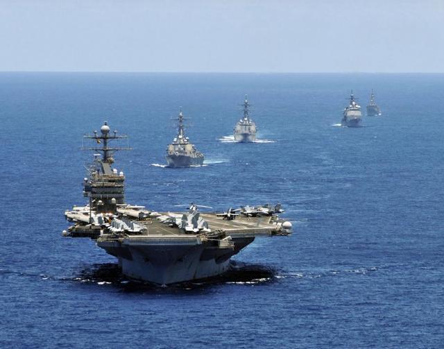 该文字的配图是,“亚伯拉罕·林肯号”航母编队在黄岩岛附近海域航行的画面。